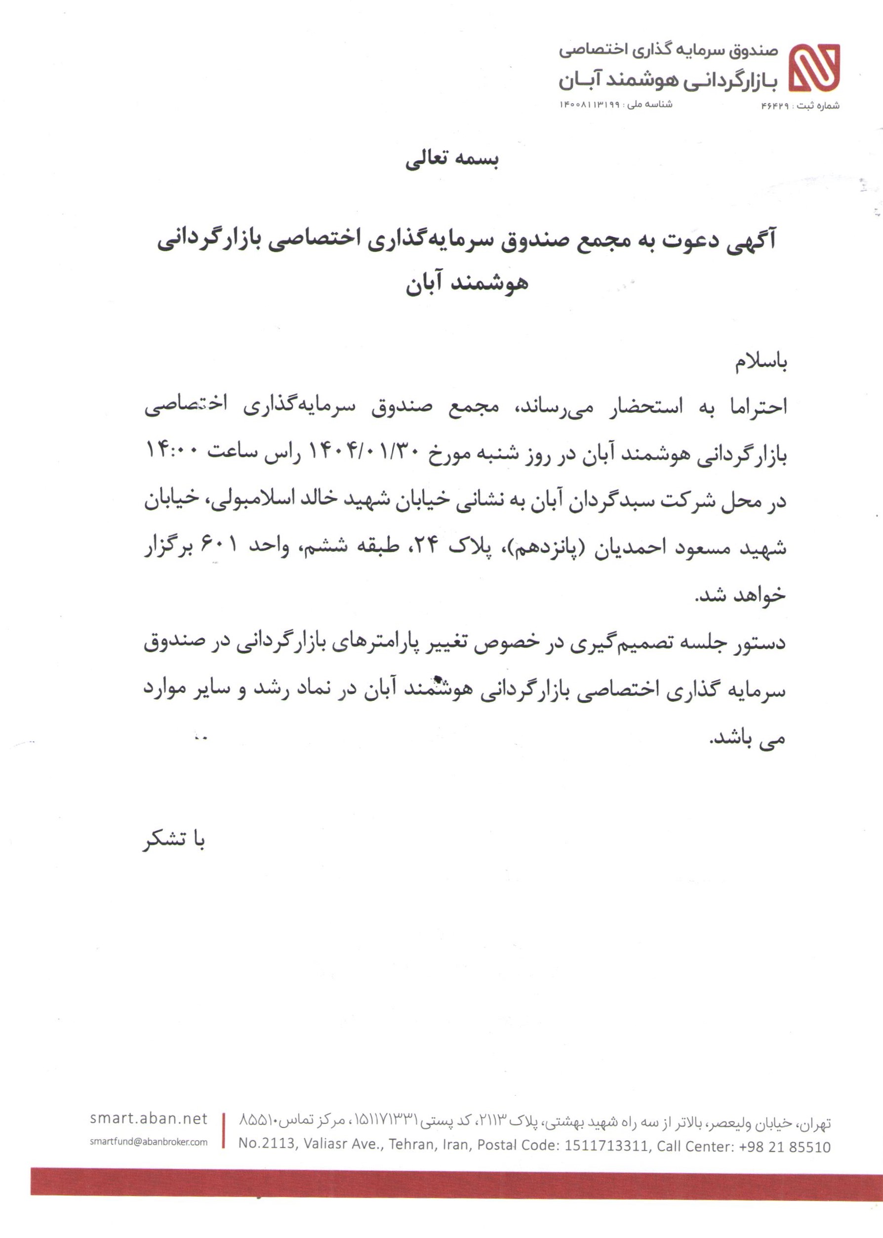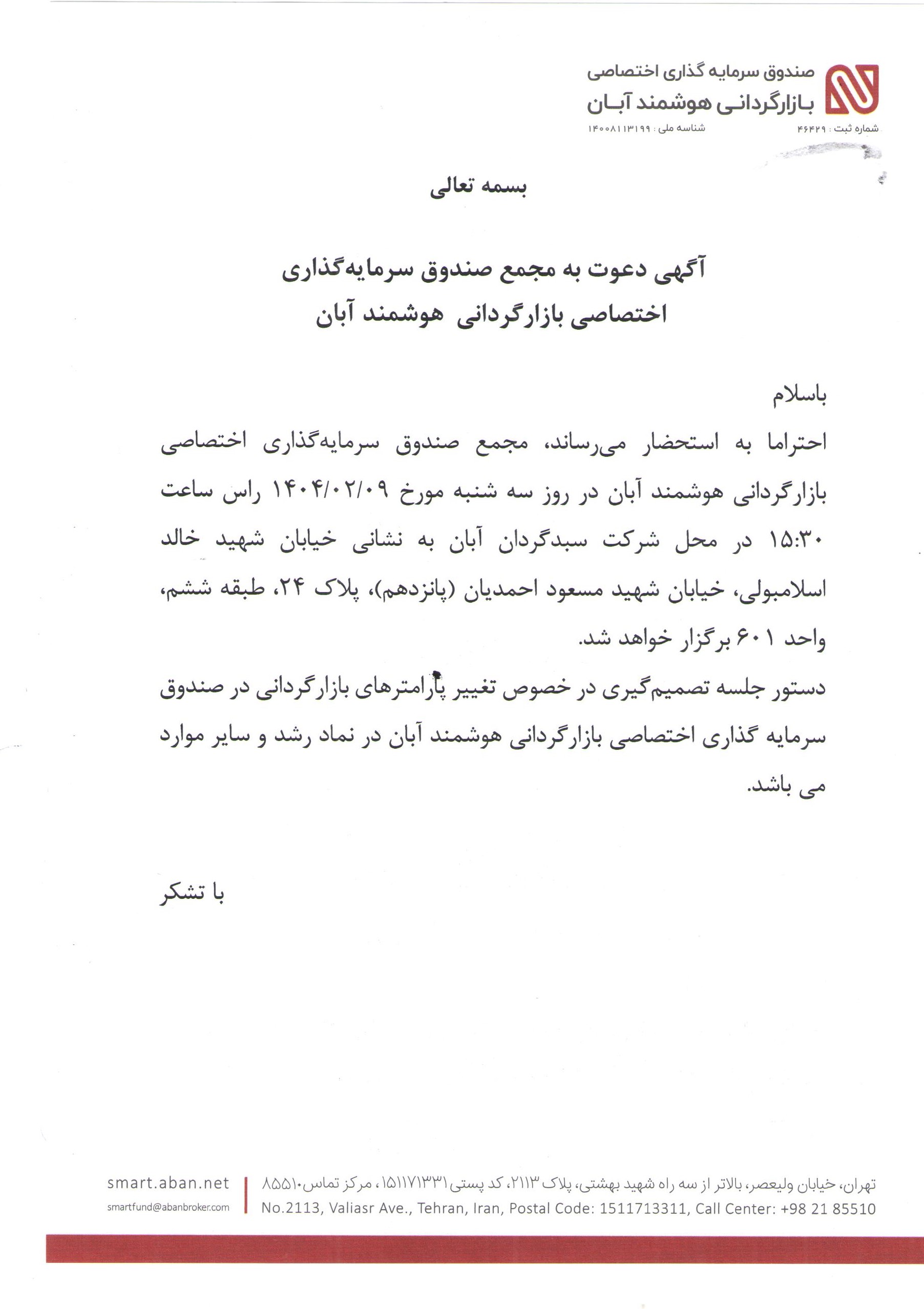 آگهی دعوت به مجمع صندوق سرمایه گذاری اختصاصی بازارگردانی هوشمند آبان با موضوع افزودن نماد تکنو و اعلام پارامترهای بازارگردانی در نماد مذکور مورخ ۱۴۰۴/02/06