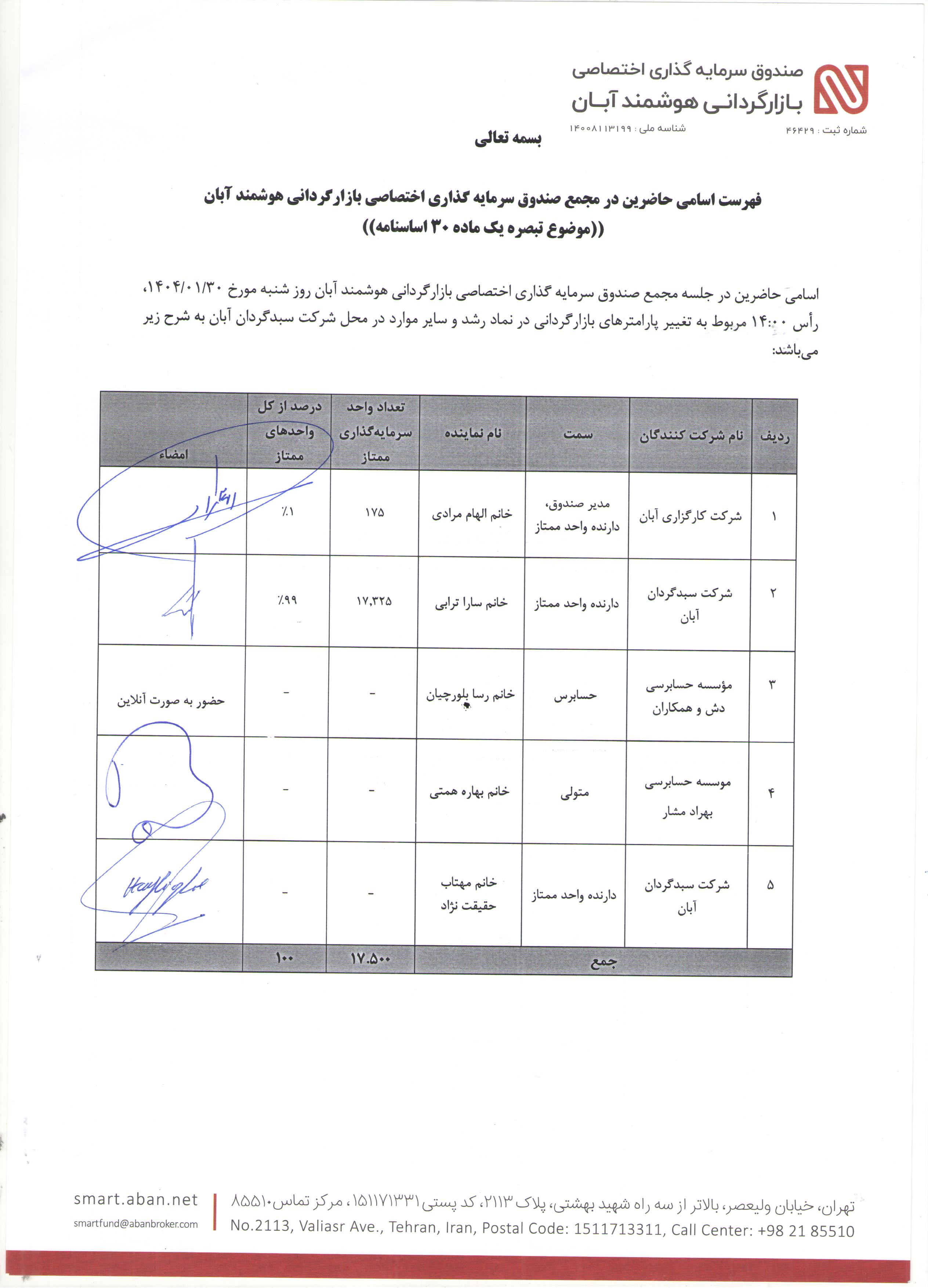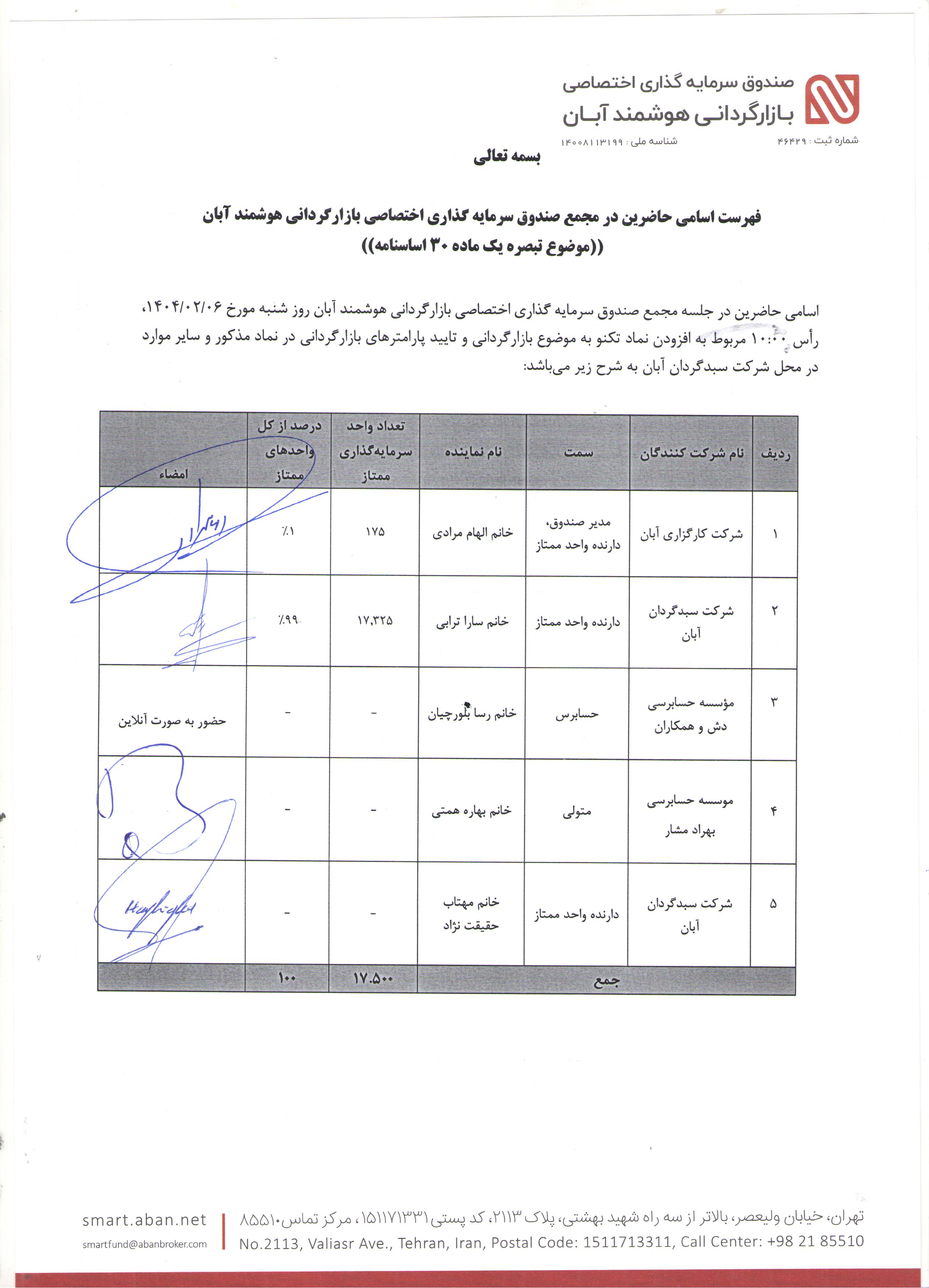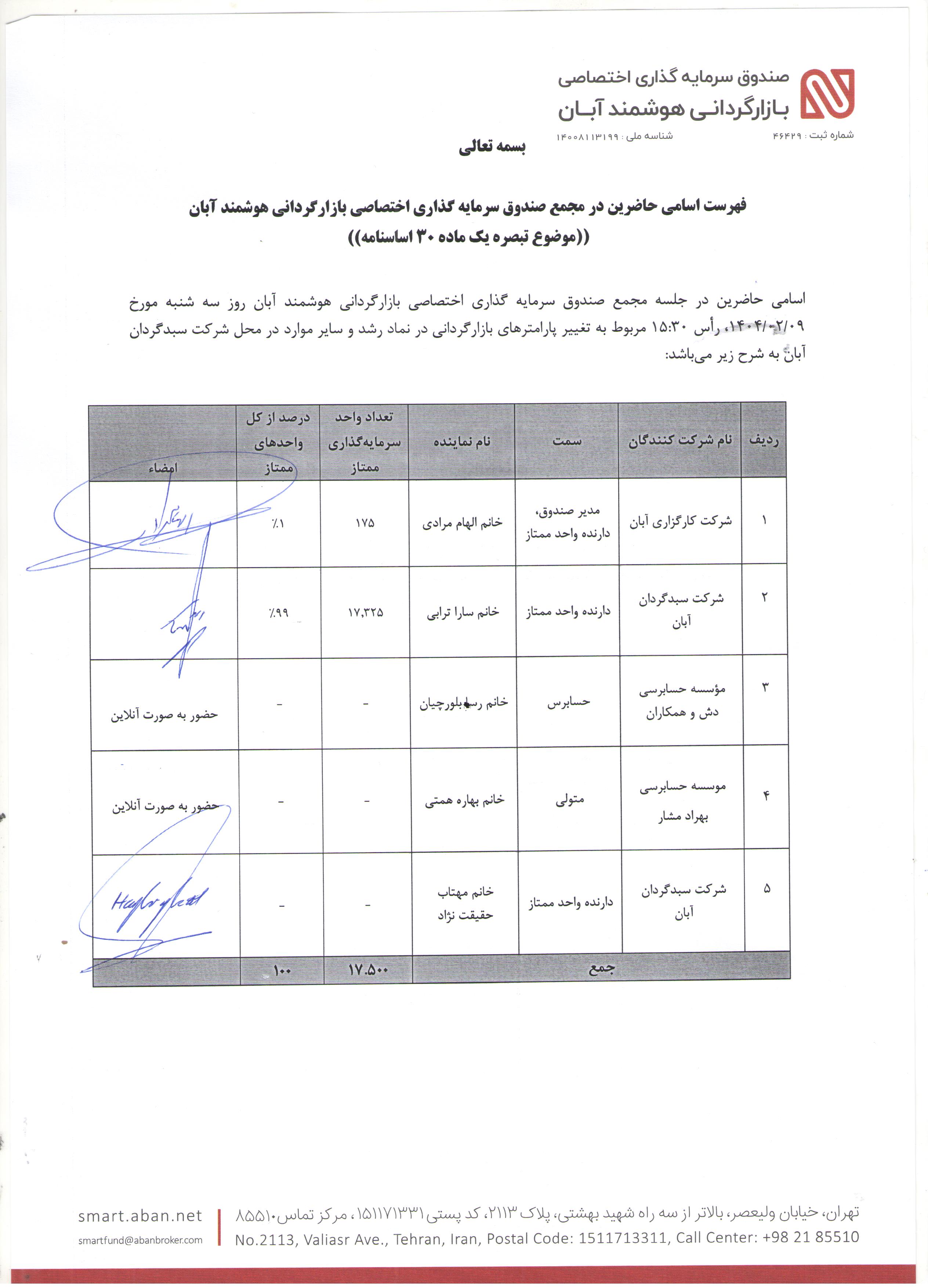 اسامی حاضرین در مجمع صندوق سرمایه گذاری اختصاصی بازارگردانی هوشمند آبان با موضوع تغییر پارامترهای بازارگردانی در نماد رشد مورخ ۱۴۰۴/۰۱/30