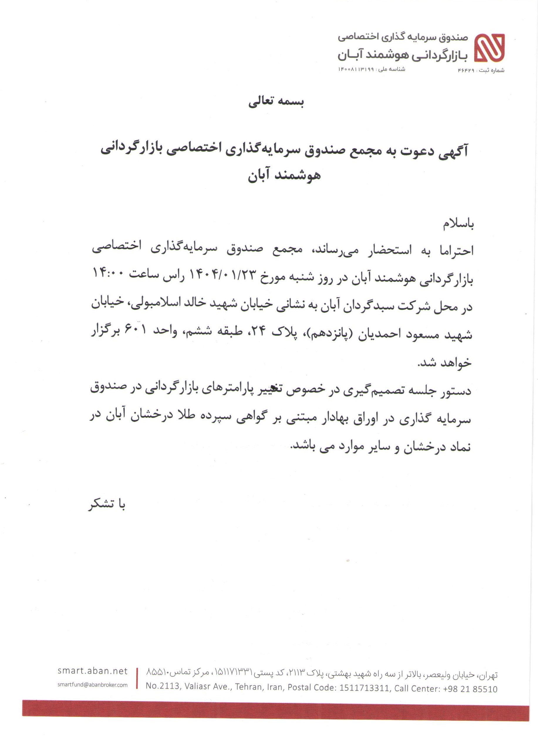 آگهی دعوت به مجمع صندوق سرمایه گذاری اختصاصی بازارگردانی هوشمند آبان با موضوع تغییر پارامترهای بازارگردانی در نماد درخشان مورخ 1404/01/23