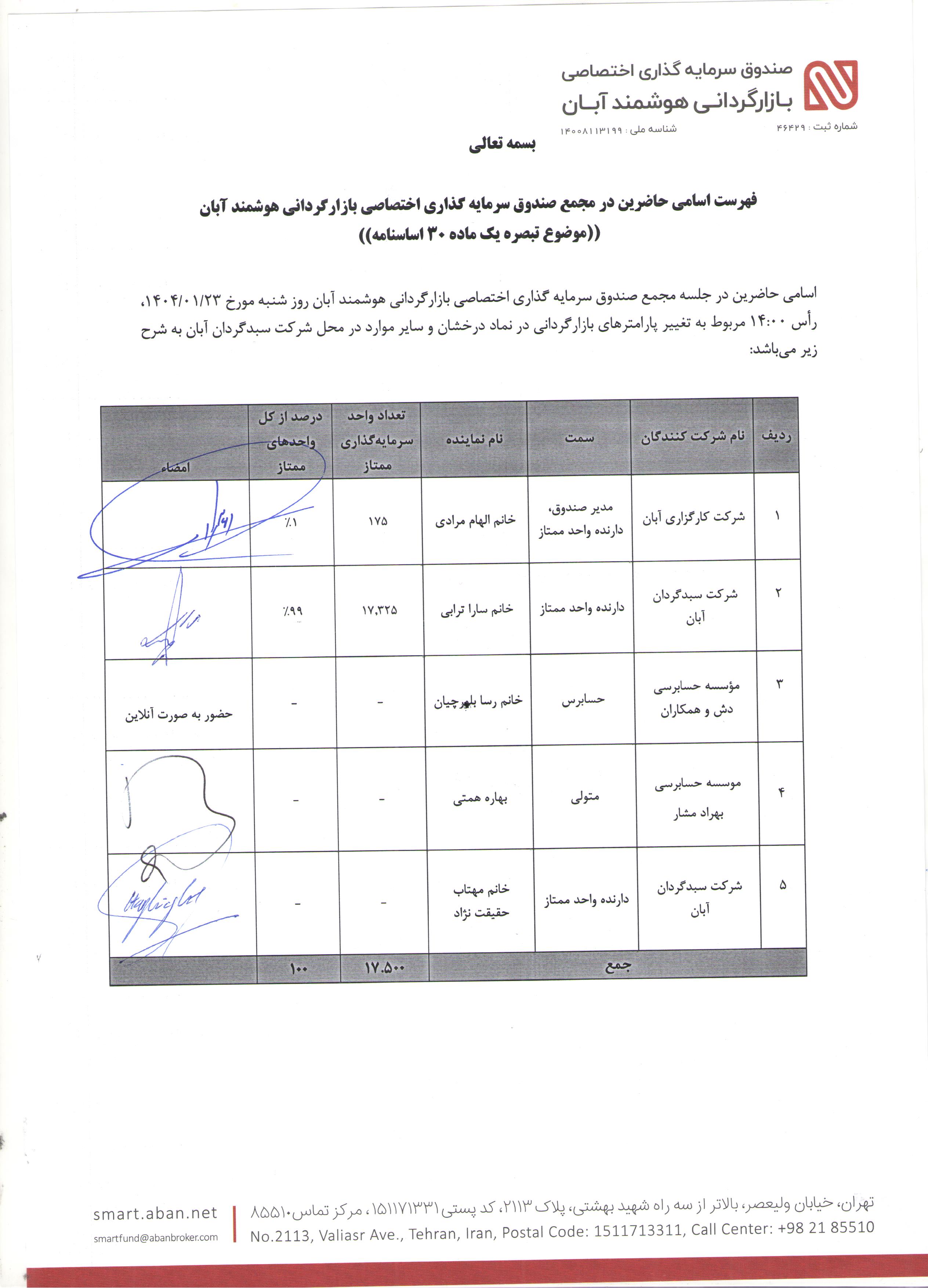 اسامی حاضرین در مجمع صندوق سرمایه گذاری اختصاصی بازارگردانی هوشمند آبان با موضوع تغییر پارامترهای بازارگردانی در نماد درخشان مورخ 1404/01/23