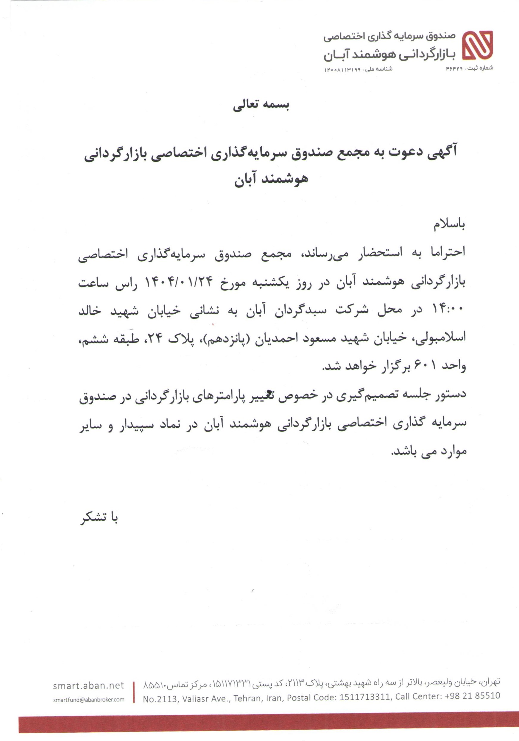 آگهی دعوت به مجمع صندوق سرمایه گذاری اختصاصی بازارگردانی هوشمند آبان با موضوع افزایش هزینه نرم افزار مورخ ۱۴۰۳/۱۲/28