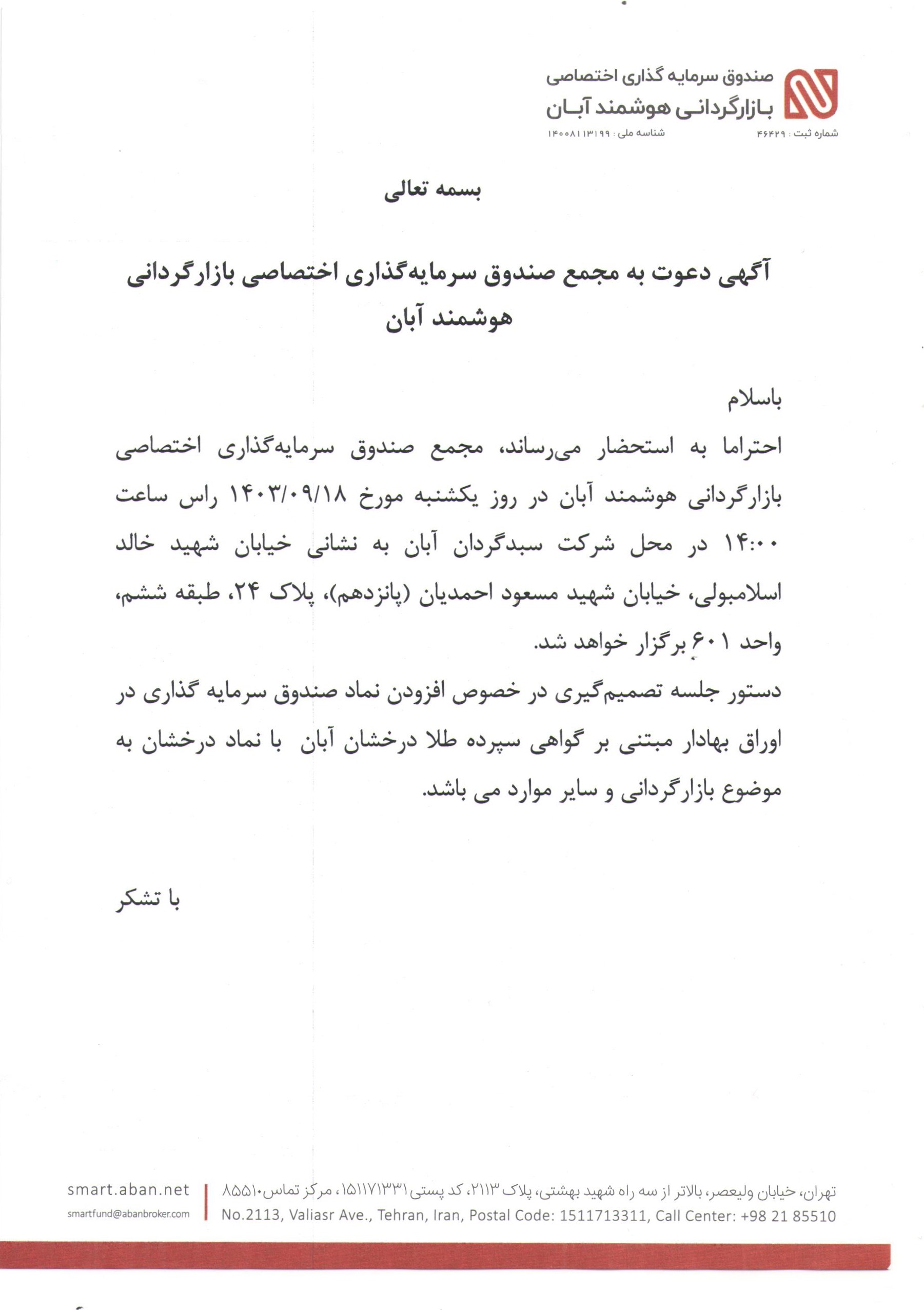 آگهی دعوت به مجمع صندوق سرمایه گذاری اختصاصی بازارگردانی هوشمند آبان با موضوع افزودن صندوق سرمایه گذاری در اوراق بهادار مبتنی بر گواهی سپرده طلا درخشان آبان با نماد درخشان به موضوع بازارگردانی صندوق مورخ 1403/09/18 ساعت 14:00