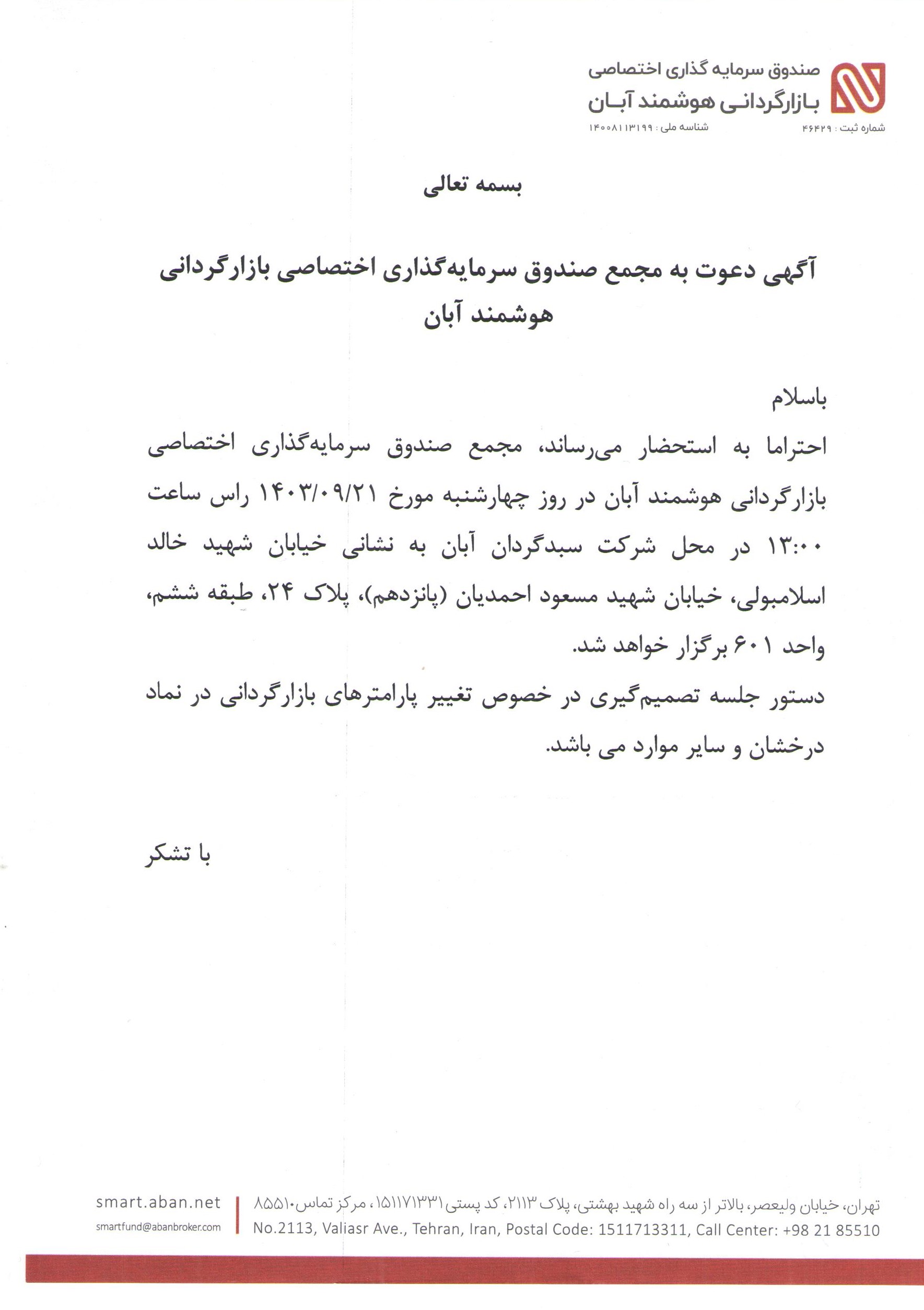 آگهی دعوت به مجمع صندوق سرمایه گذاری اختصاصی بازارگردانی هوشمند آبان با موضوع تغییر پارامترهای بازارگردانی در نماد درخشان مورخ ۱۴۰۳/۰9/21