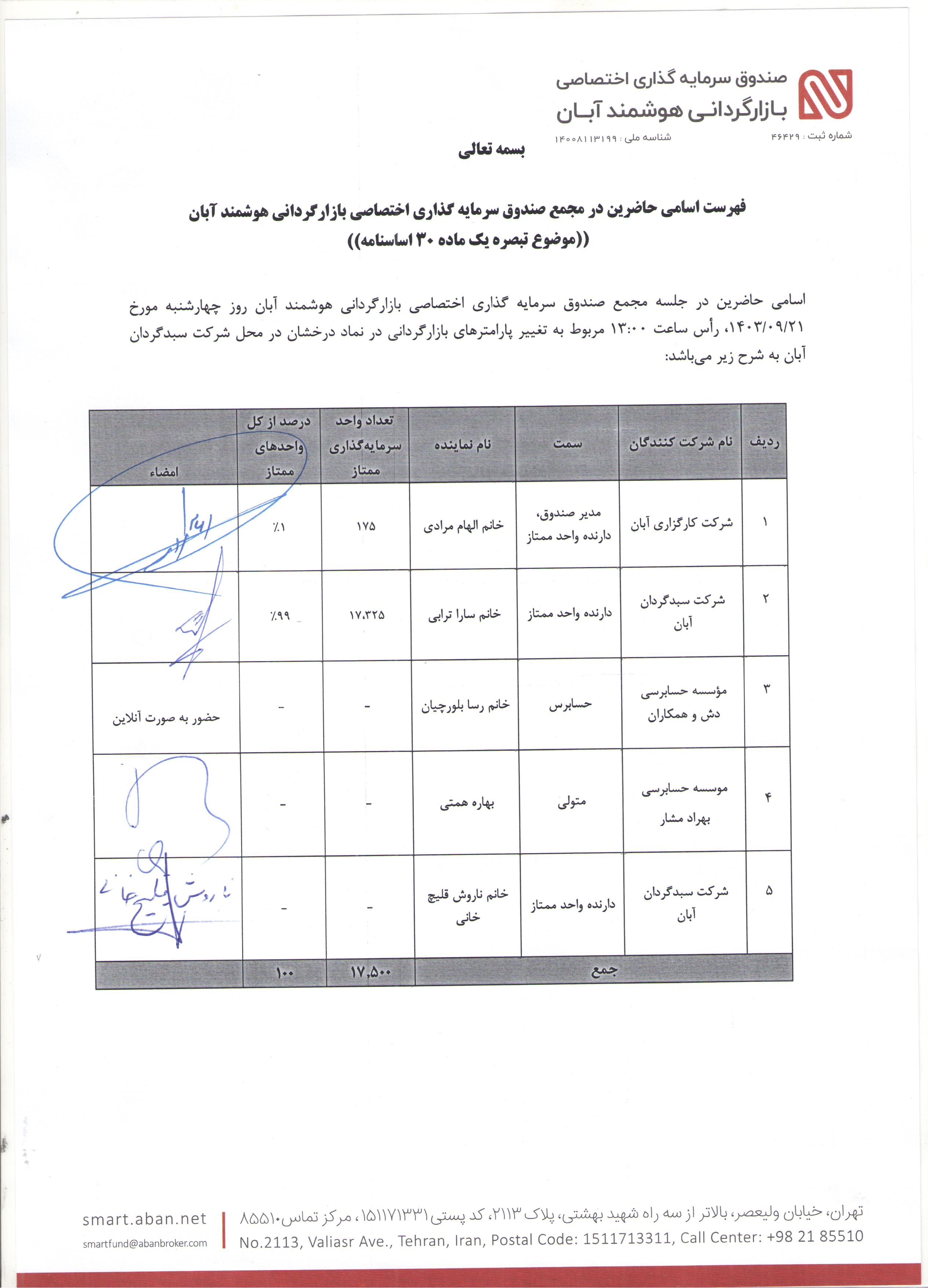اسامی حاضرین در مجمع صندوق سرمایه گذاری اختصاصی بازارگردانی هوشمند آبان با موضوع افزودن صندوق سرمایه گذاری در اوراق بهادار مبتنی بر گواهی سپرده طلا درخشان آبان با نماد درخشان به موضوع بازارگردانی صندوق مزبور مورخ 1403/09/18 ساعت 14:00