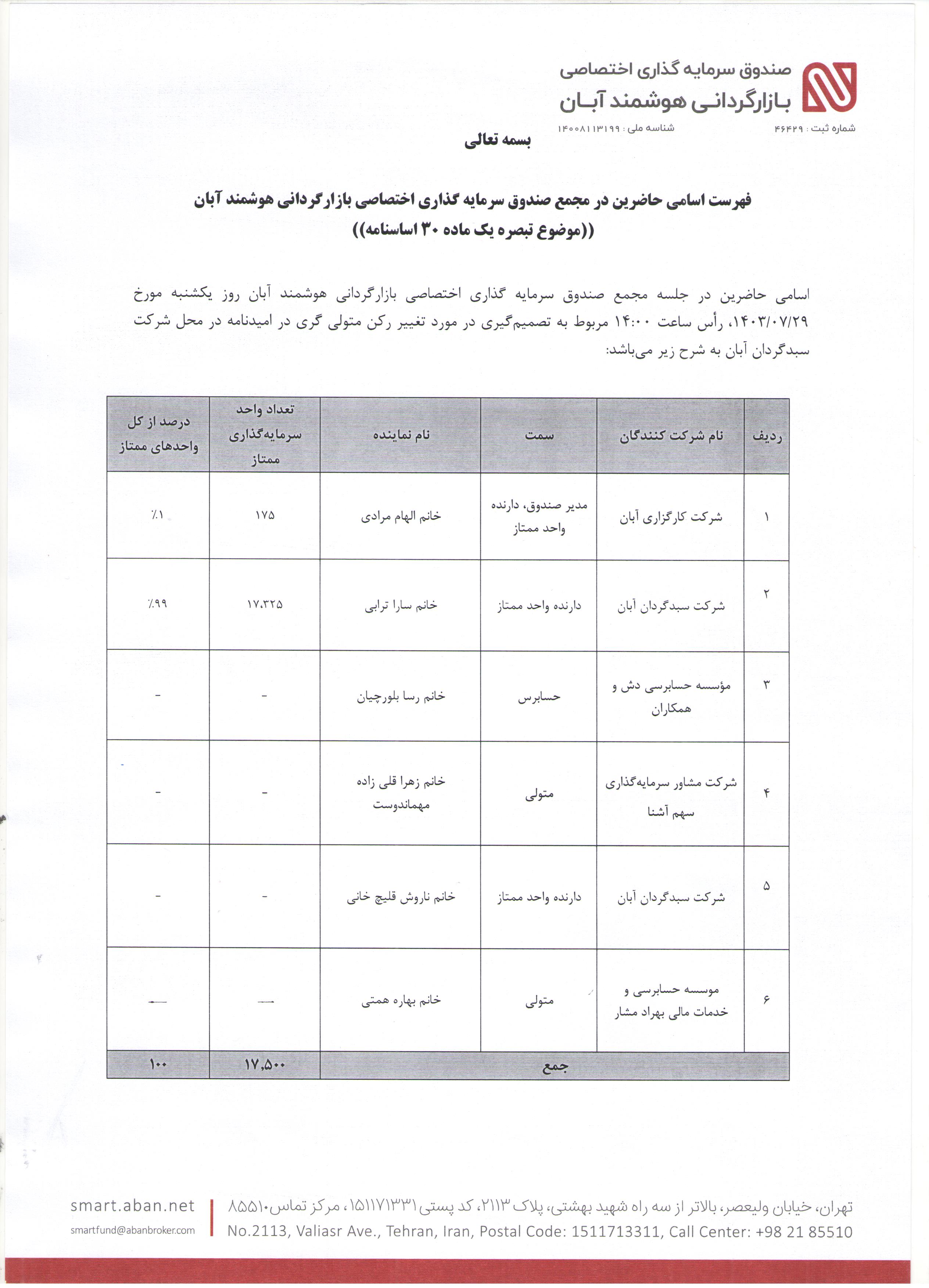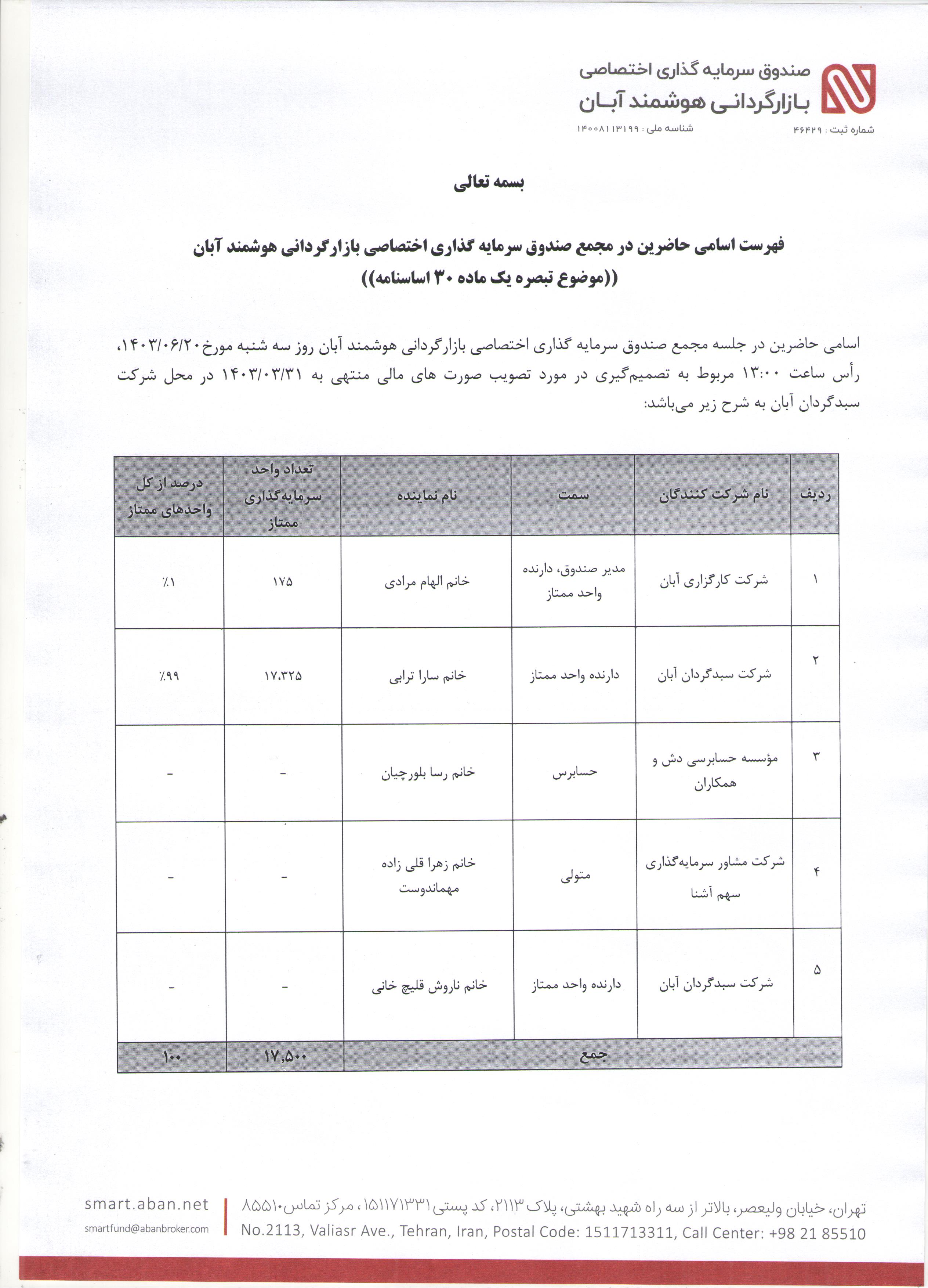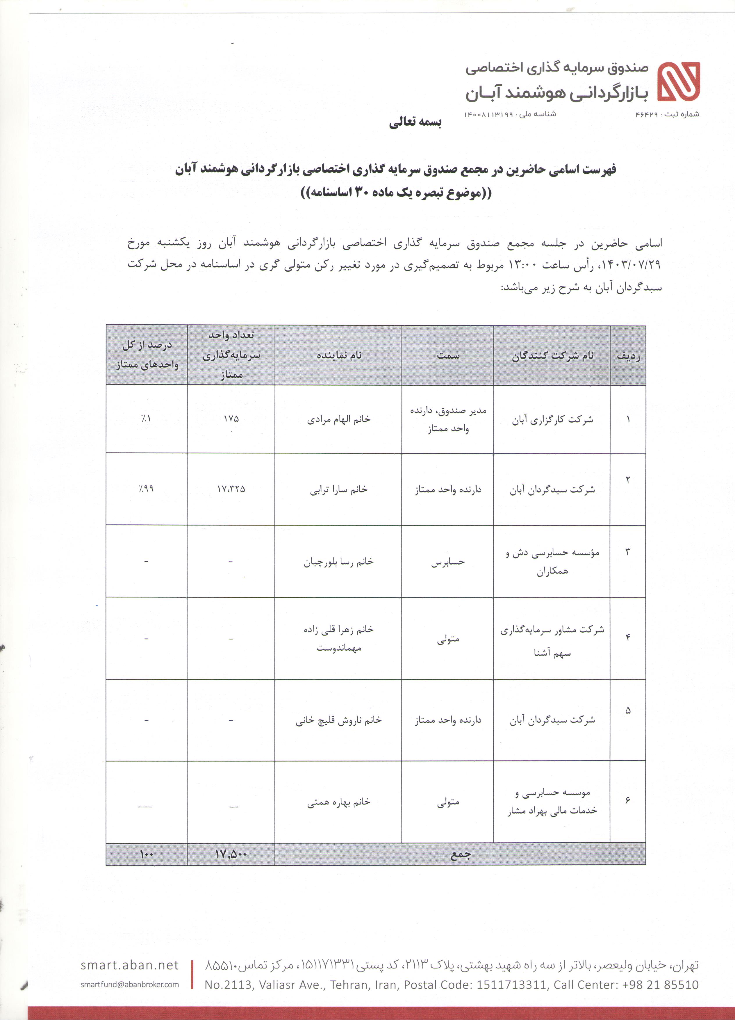اسامی حاضرین در مجمع صندوق سرمایه گذاری اختصاصی بازارگردان هوشمند آبان با موضوع تصویب صورت های مالی منتهی به 1403/03/31 مورخ 1403/06/20 ساعت 13:00