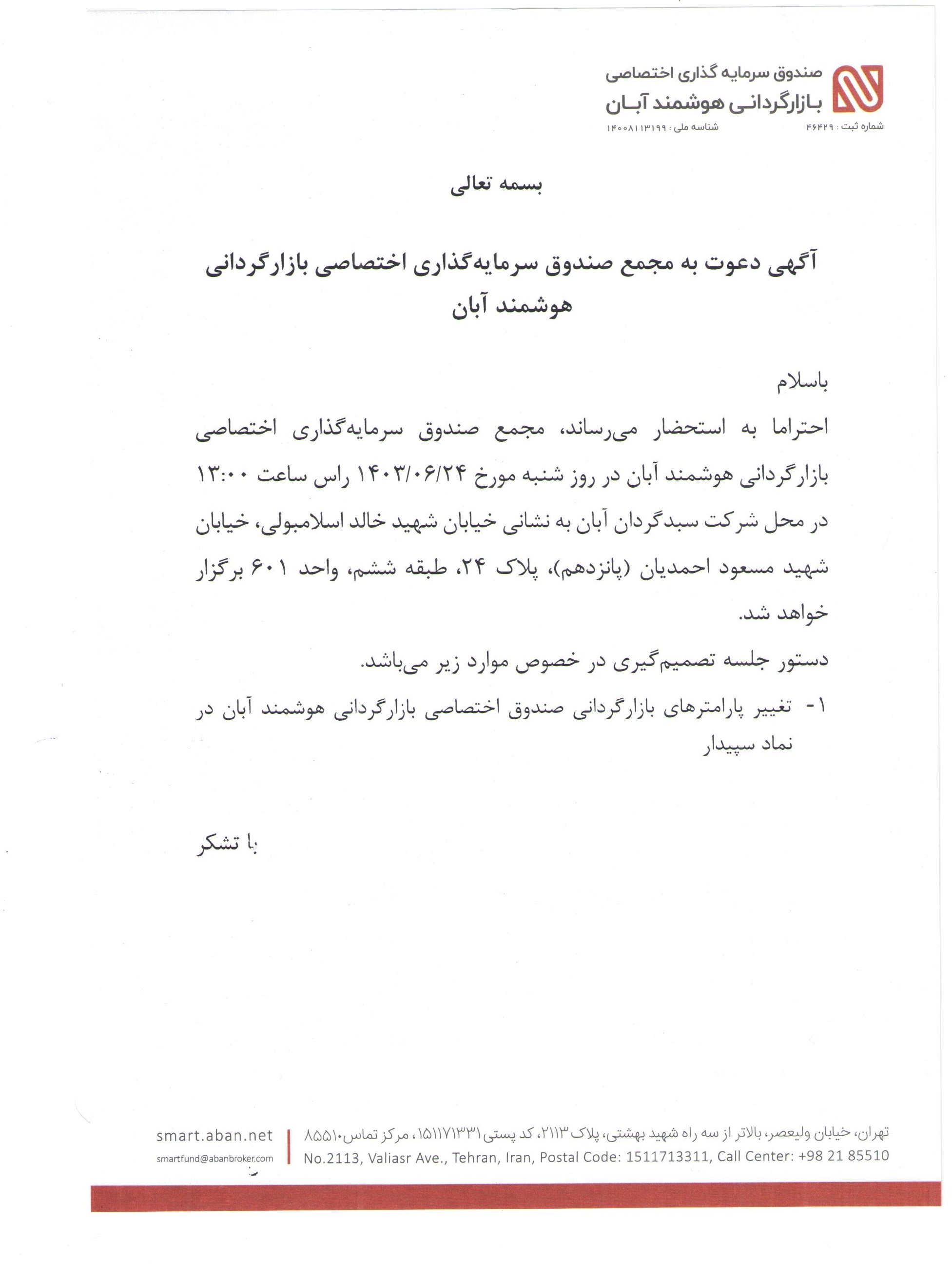 آگهی دعوت به مجمع صندوق سرمایه گذاری اختصاصی بازارگردانی هوشمند آبان با موضوع تغییر پارامترهای بازارگردانی در نماد سپیدار مورخ 1403/06/24