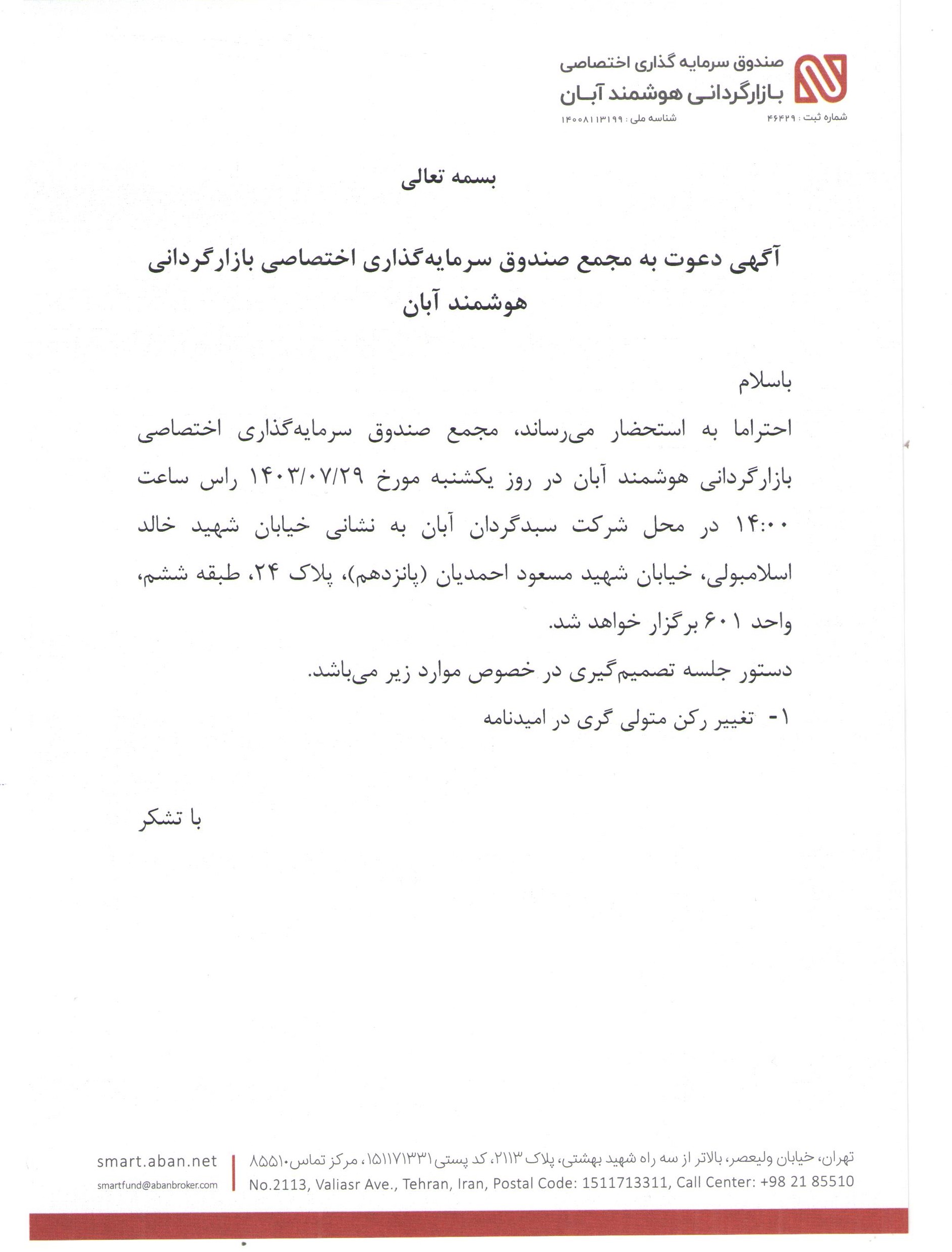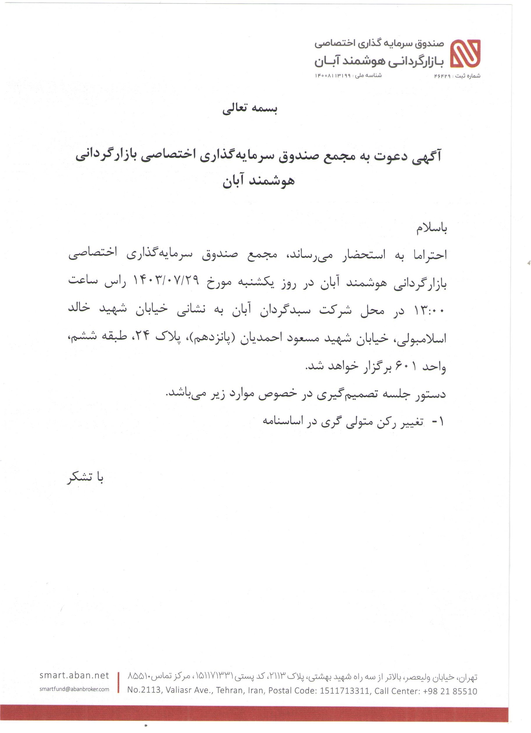 آگهی دعوت به مجمع صندوق سرمایه گذاری اختصاصی بازارگردانی هوشمند آبان با موضوع تغییر رکن متولی گری ( در اساسنامه) مورخ ۱۴۰۳/07/29 ساعت 13:00