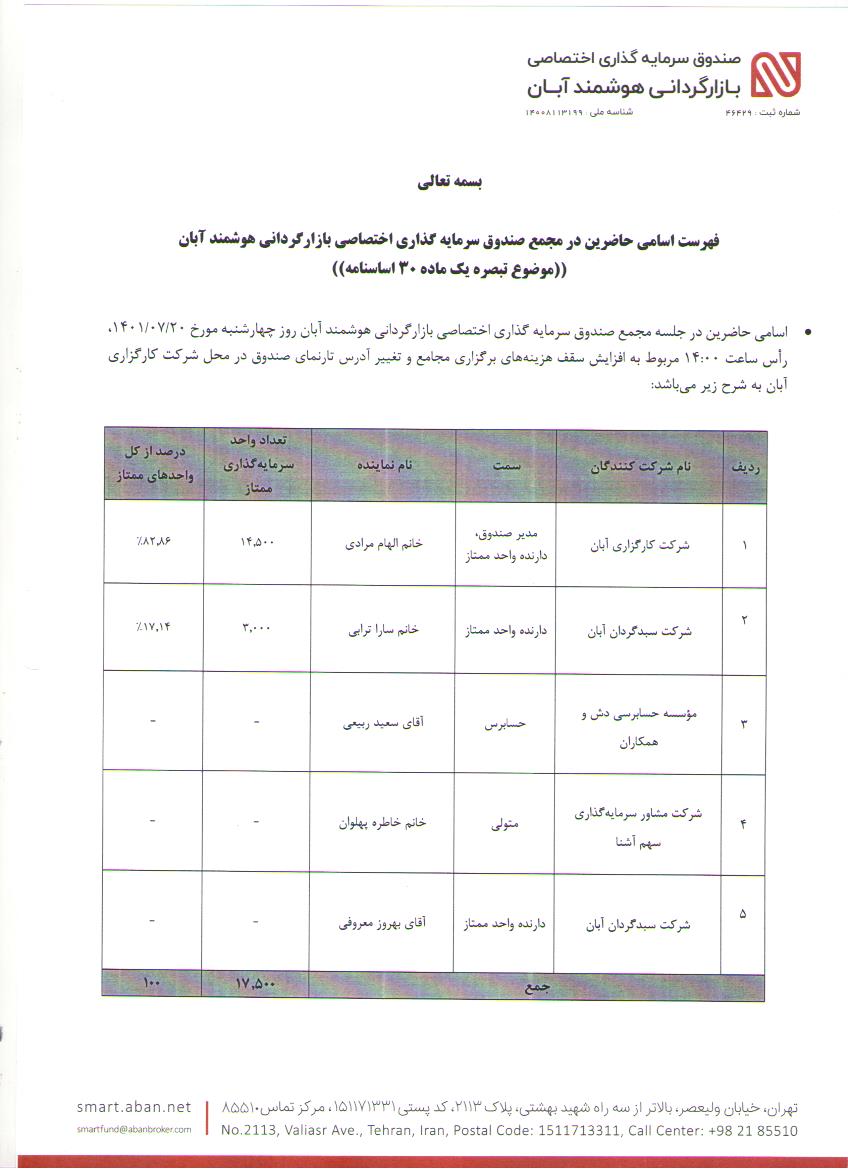 اسامی حاضرین در مجمع صندوق سرمایه گذاری اختصاصی بازارگردانی هوشمند آبان مورخ 1401/07/20 مربوط به افزایش سقف هزینه های برگزاری مجامع و تغییر آدرس تارنمای صندوق