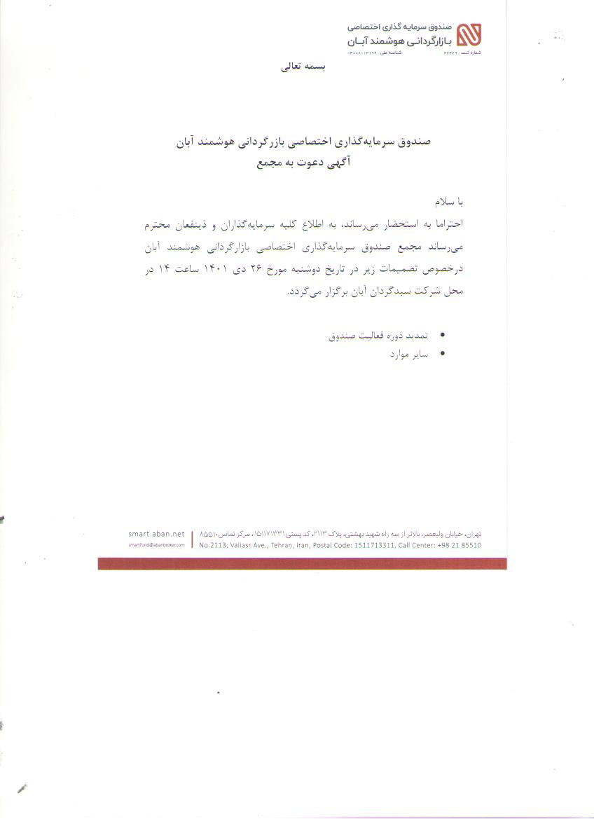 آگهی دعوت به مجمع صندوق سرمایه گذاری اختصاصی بازارگردانی هوشمند آبان مورخ 1401/10/26 مربوط به تمدید دوره فعالیت صندوق و سایر موارد