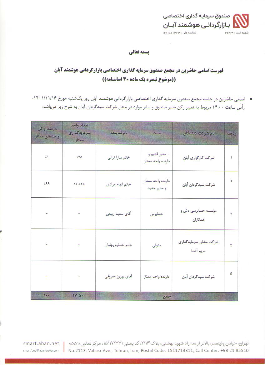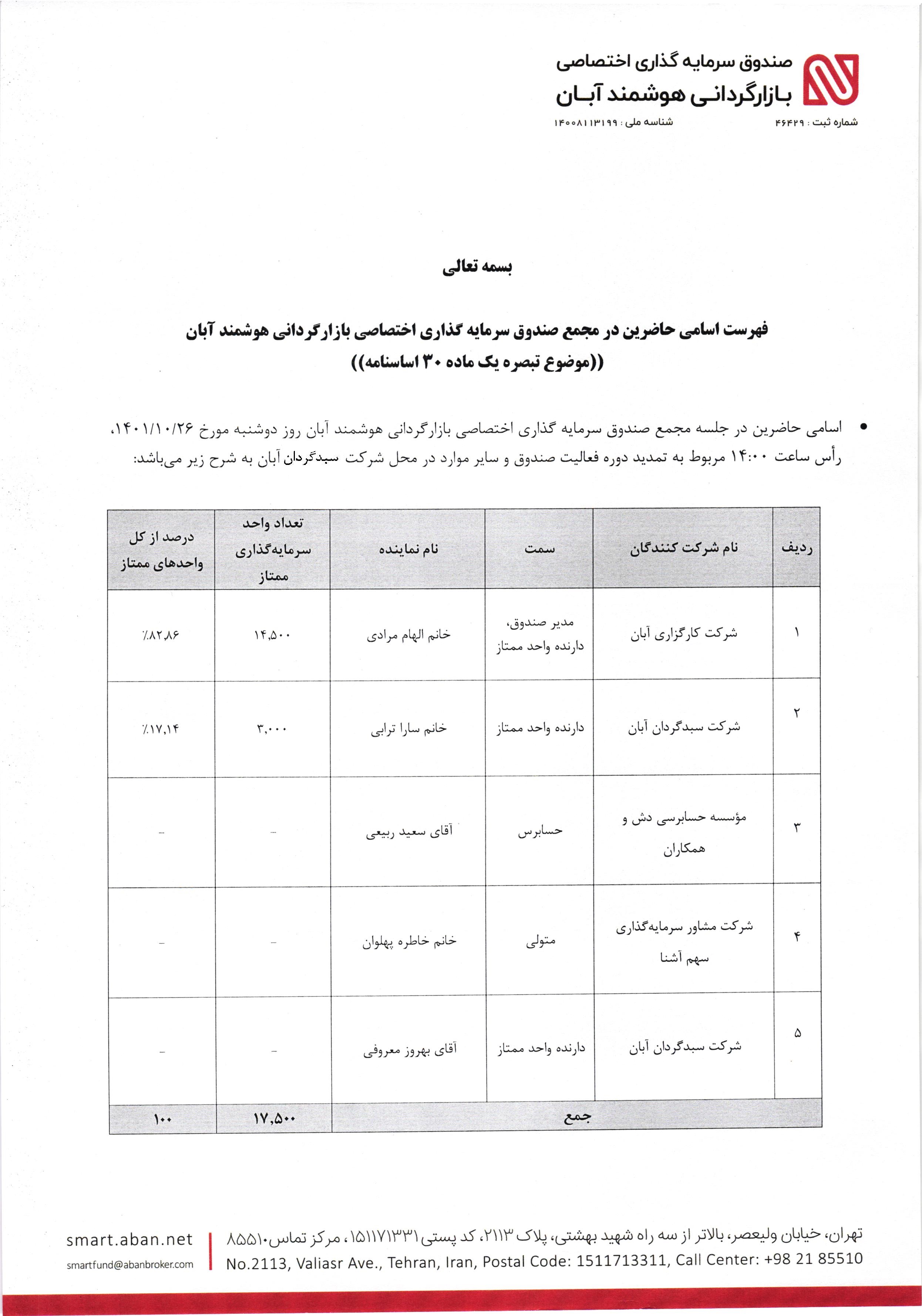 اسامی حاضرین در مجمع صندوق سرمایه گذاری اختصاصی بازارگردانی هوشمند آبان مورخ 1401/10/26 مربوط به تمدید دوره فعالیت صندوق و سایر موارد