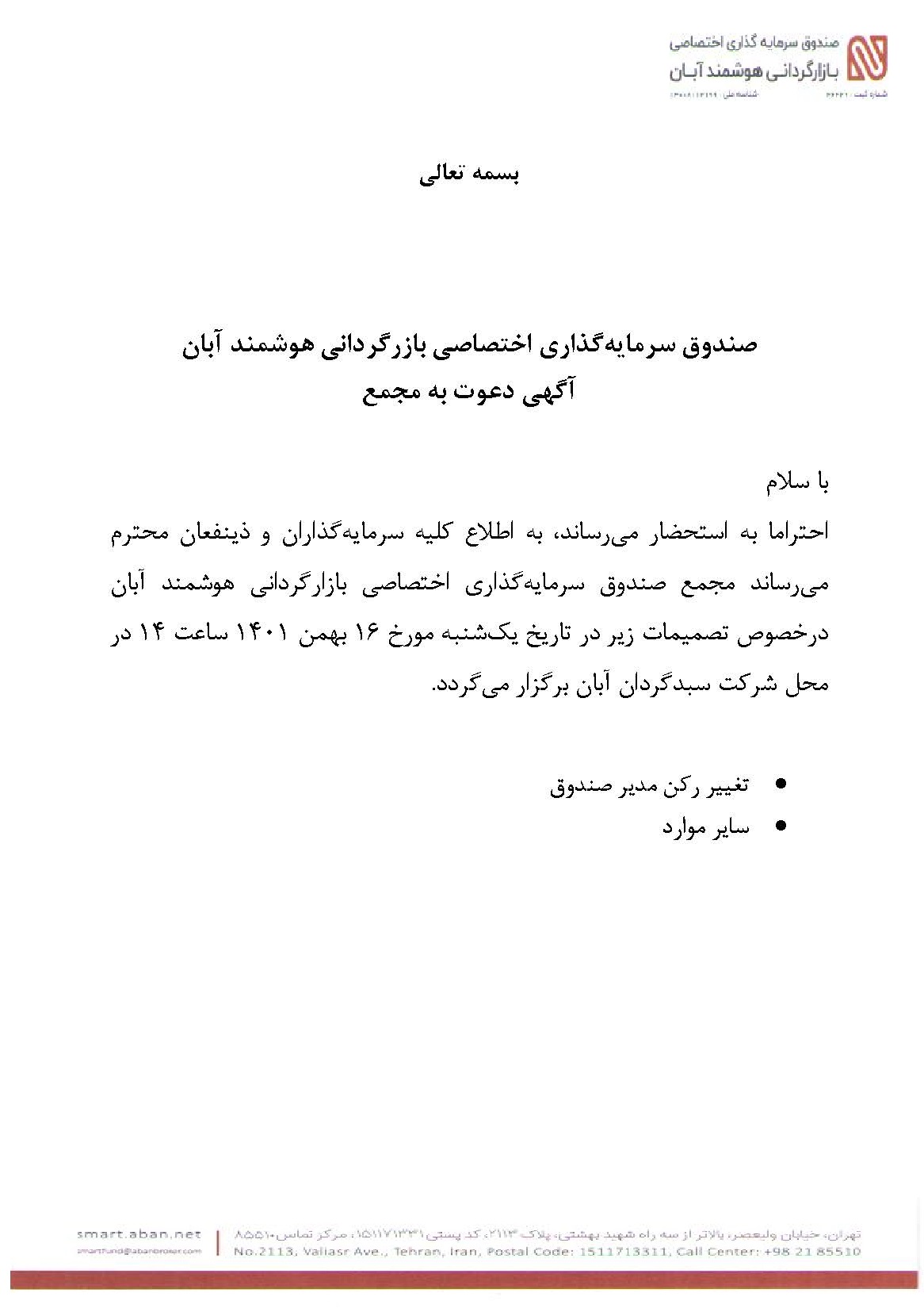 آگهی دعوت به مجمع صندوق سرمایه گذاری اختصاصی بازارگردانی هوشمند آبان مورخ 1401/11/16 مربوط به تغییر رکن مدیر صندوق و سایر موارد