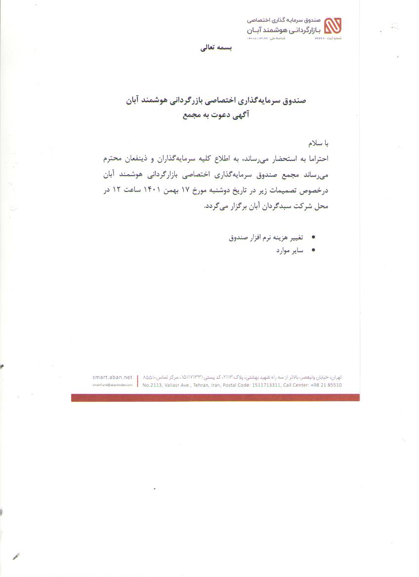 آگهی دعوت به مجمع صندوق سرمایه گذاری اختصاصی بازارگردانی هوشمند آبان مورخ 1401/11/17 مربوط به تغییر هزینه نرم افزار صندوق و سایر موارد
