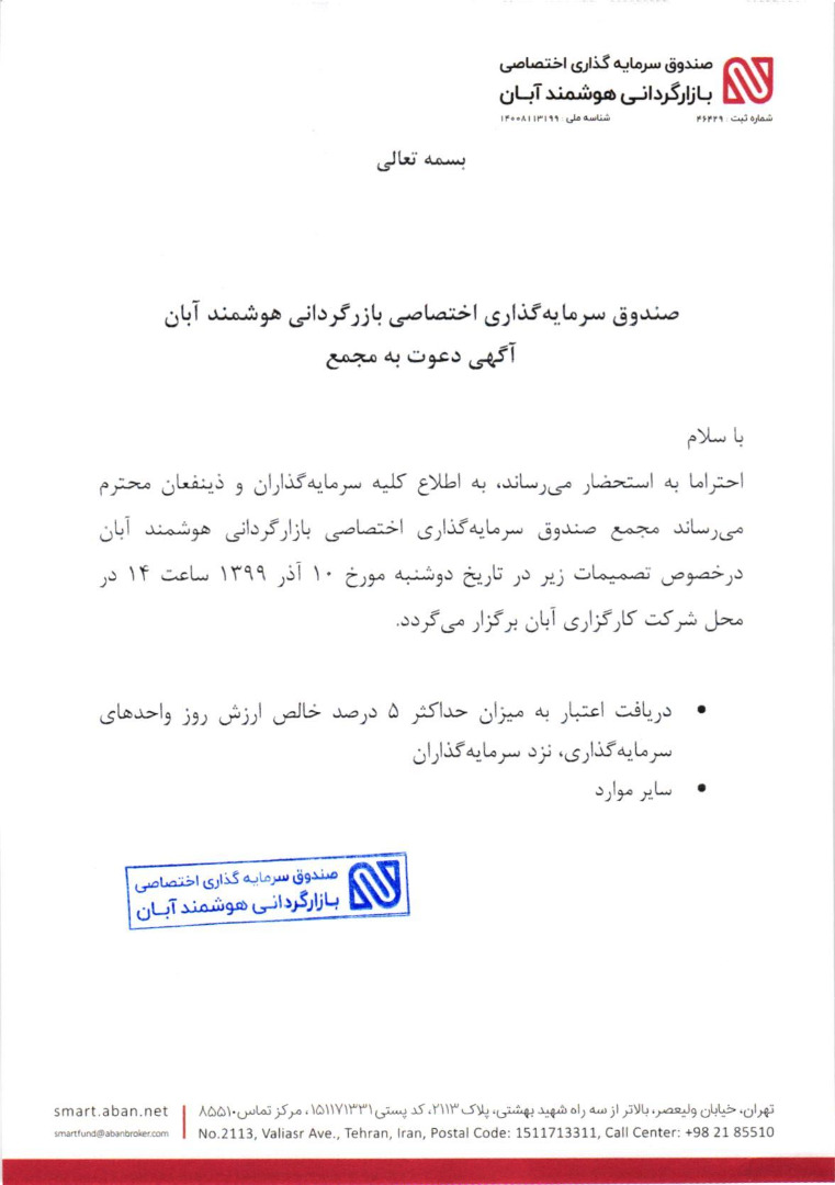 آگهی دعوت به مجمع صندوق سرمایه گذاری اختصاصی بازارگردانی هوشمند آبان مورخ 1399/09/10 با موضوع دریافت اعتبار