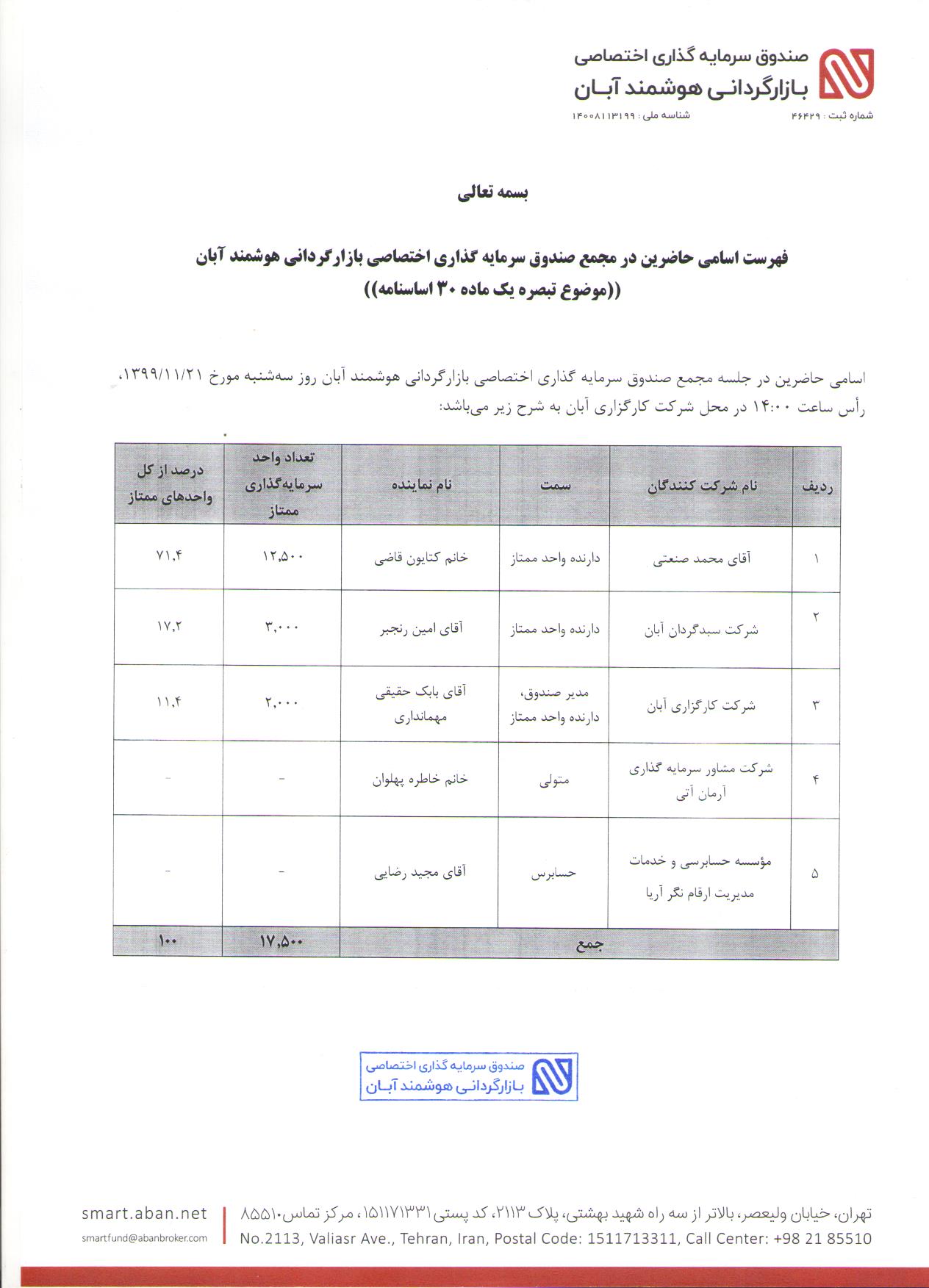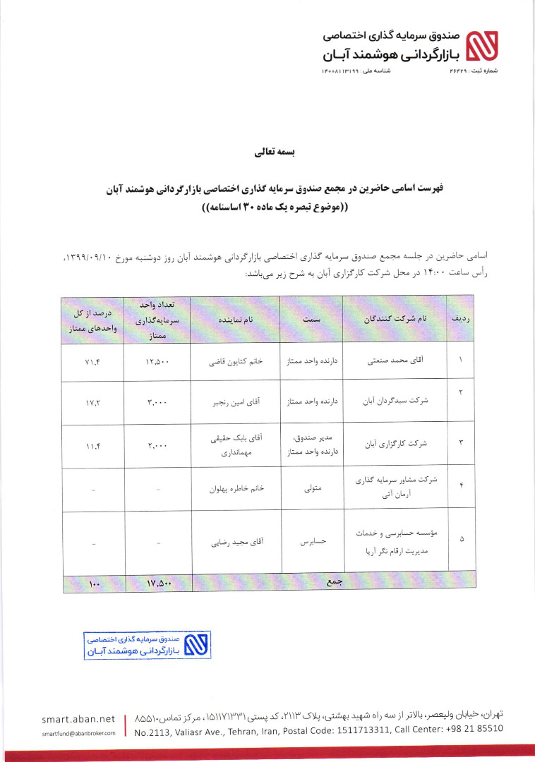 فهرست اسامی حاضرین در مجمع مورخ 1399/11/21 با موضوع حذف نماد کرازی از موضوع بازارگردانی صندوق