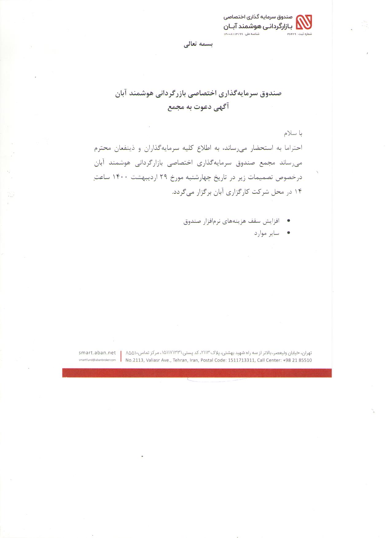 آگهی دعوت به مجمع صندوق سرمایه گذاری اختصاصی بازارگردانی هوشمند آبان مورخ 1400/02/29 با موضوع افزایش سقف هزینه های نرم افزار صندوق