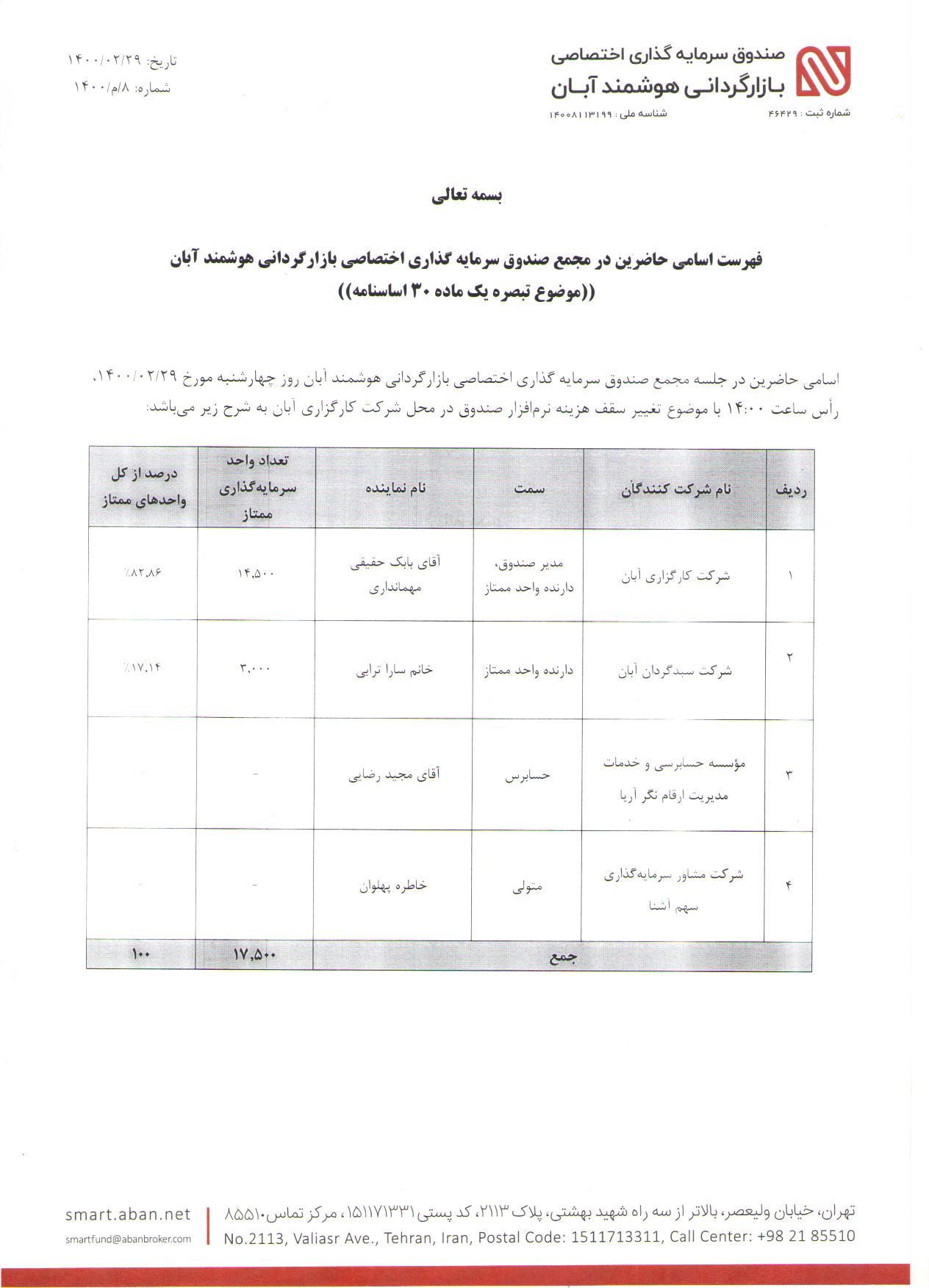 فهرست اسامی حاضرین در مجمع مورخ 1400/02/29 با موضوع افزایش سقف هزینه نرم افزار صندوق