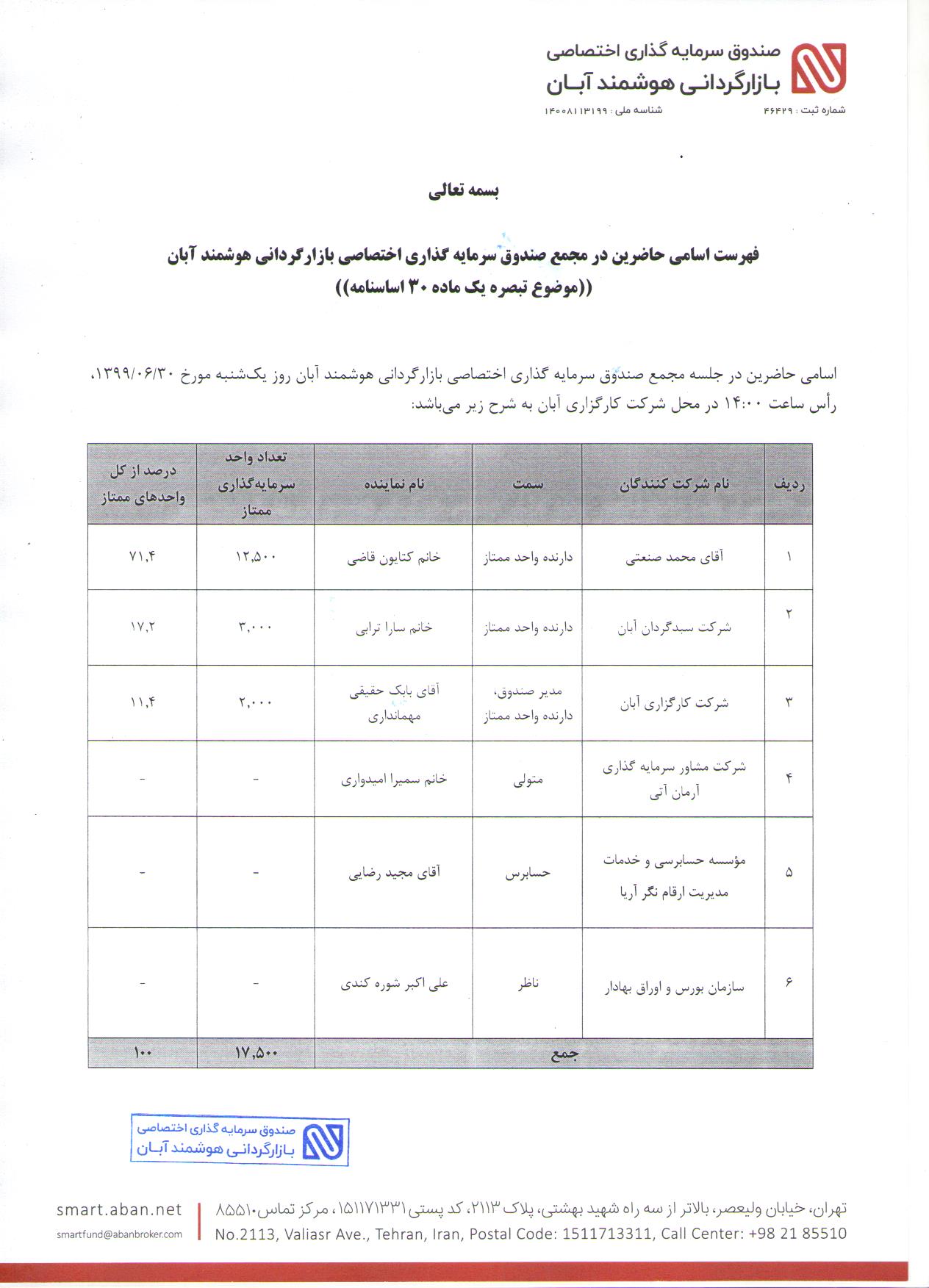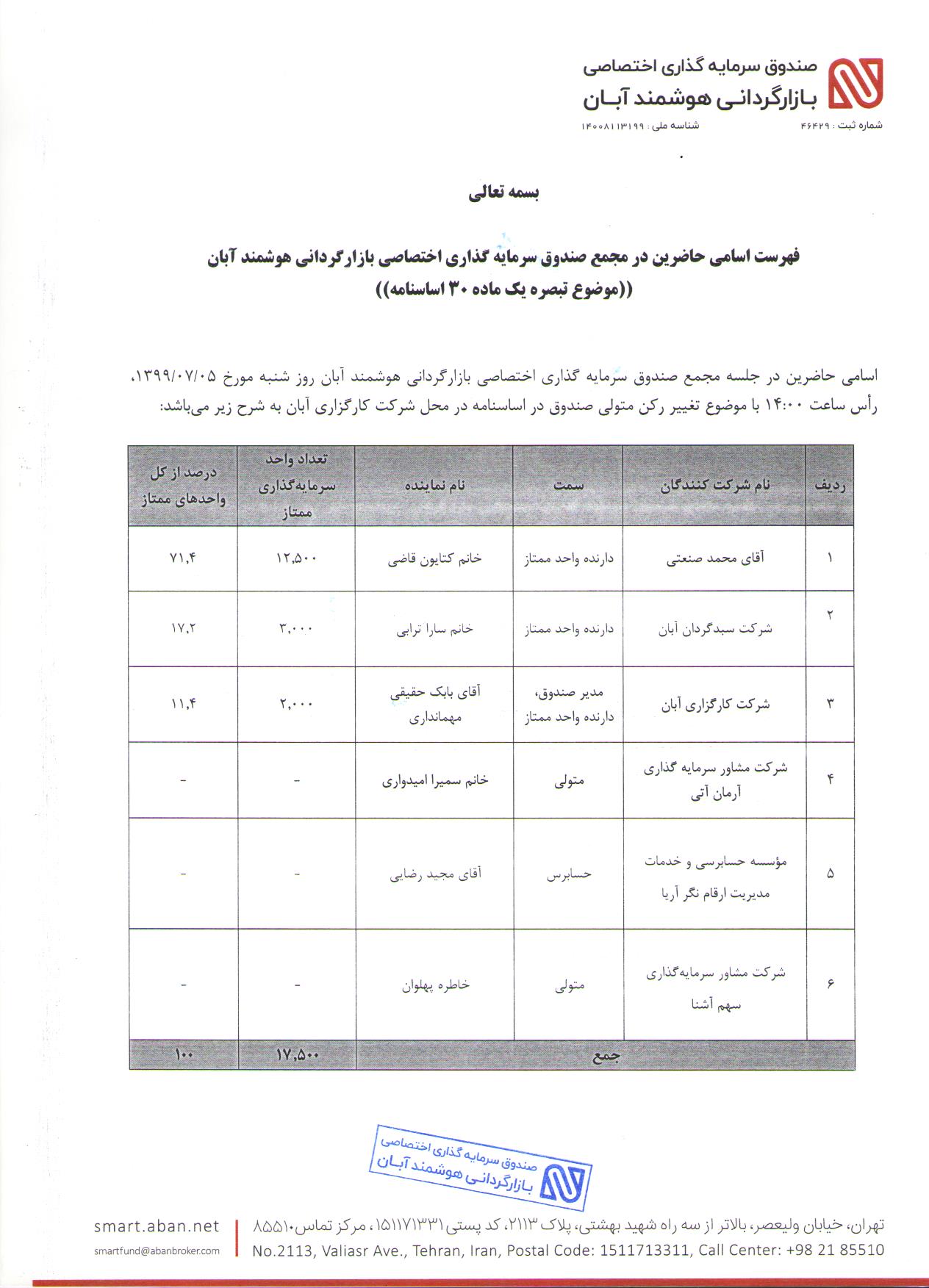 فهرست اسامی حاضرین در مجمع مورخ 1399/07/05 با موضوع تغییر متولی صندوق در امید نامه